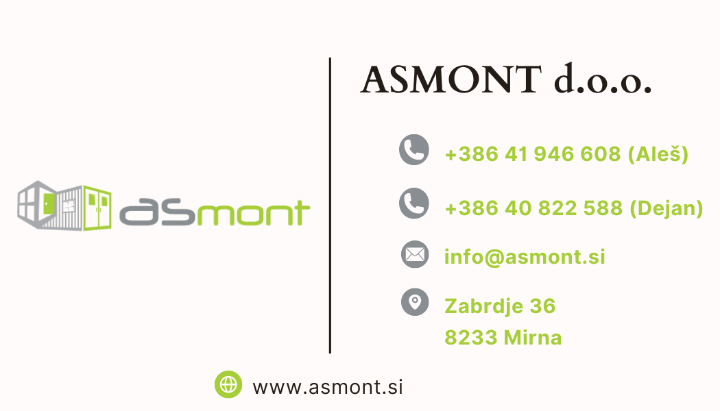 V podjetju ASMONT d.o.o., vam nudimo širok izbor kontejnerjev, primerni za skladiščenje, pisarno, delavnico, shranjevanje stvari, bivanje in še za nešteto drugih možnosti uporabe.